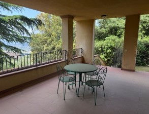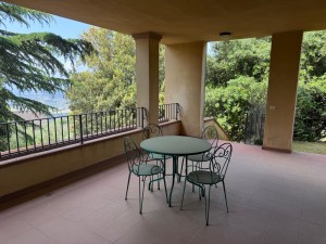 Al primo piano, la villa dispone di tre camere da letto, due bagni e due terrazzi, ideali per rilassarsi e godere della vista. Il piano seminterrato offre ulteriori spazi utili come fondi, ripostigli e un garage, rendendo questa proprietà estremamente funzionale. Gli interni sono in buonissime condizioni, con pavimenti in cotto e infissi in legno con vetrocamera, garantendo comfort e isolamento termico.